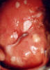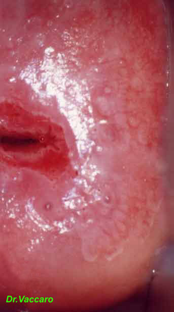 Il TV è un protozoo flagellato che colonizza vagina uretra e ghiandole parauretrali. E' responsabile di vaginiti con leucorrea verdastra e schiumosa, ma può essere asintomatico. Il partner è generalmente coinvolto e può avere come complicazione una fastidiosa prostatite. Colposcopicamente il quadro classico è quello della cervicite a fragola: una cervicite essudativa (foto) con focolai diffusi a tutta la cervice e vagina. La leucorrea è grigio verdastra e schiumosa.Tipico è l'aspetto dopo lugol. I quadri colposcopici non sono però sempre così franchi. |