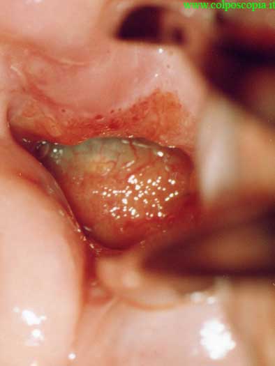 Sondando il canale cervicale si osservano due formazioni polipoidi. La formazione di sx che appare più rossa, è rivestita da epitelio ghiandolare, mentre la formazione di dx è rivestita da epitelio pavimentoso metaplasico. Se ne deduce che quest'ultima è di datazione antecedente rispetto alla prima. |