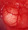 Particolare di una cisti di naboth sulla cui superfice si osserva una normale trama vascolare con regolari dicotomie.La osservazione di questo quadro vascolare regolare permette di apprezzare meglio le atipie vascolari esposte in seguito. |